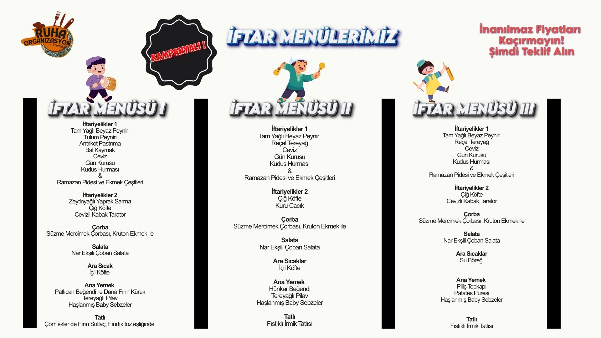Şirketlerinize, fabrikalarınıza ve istediğiniz her türlü iş dalına hizmet verecek şekilde donanımlı menüler sadece Ruha'da !